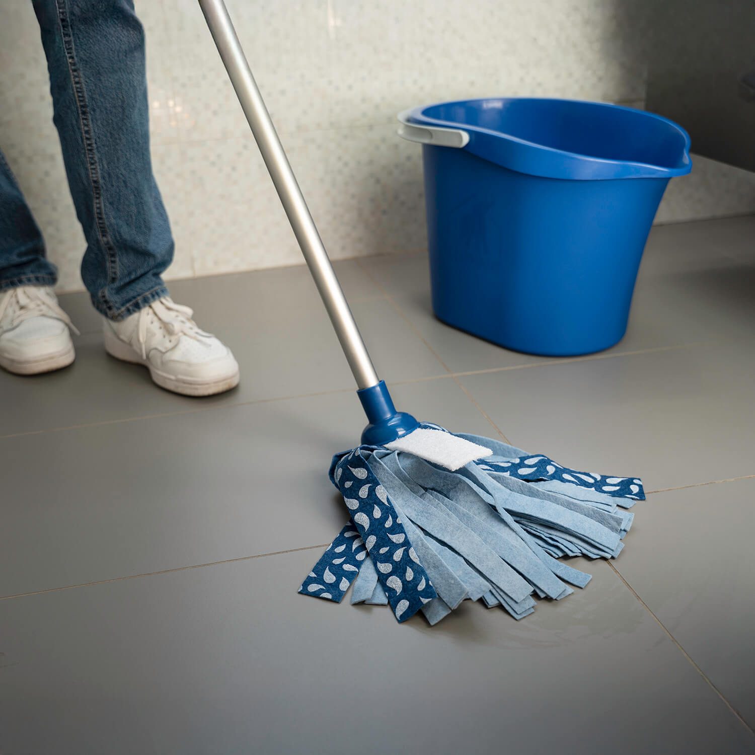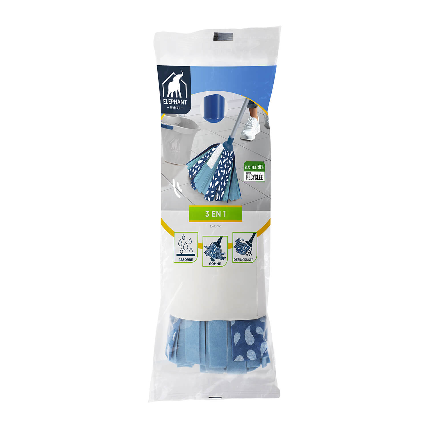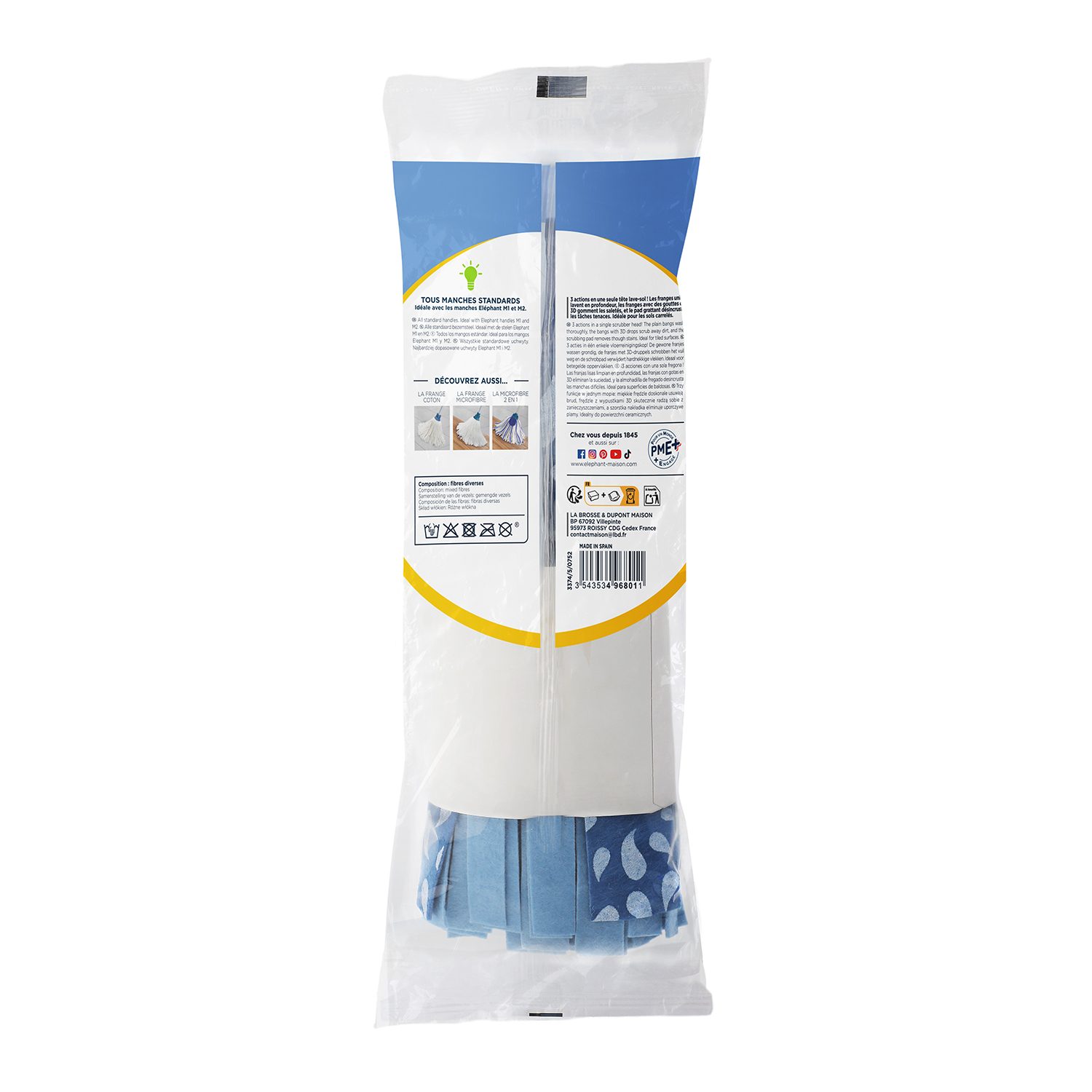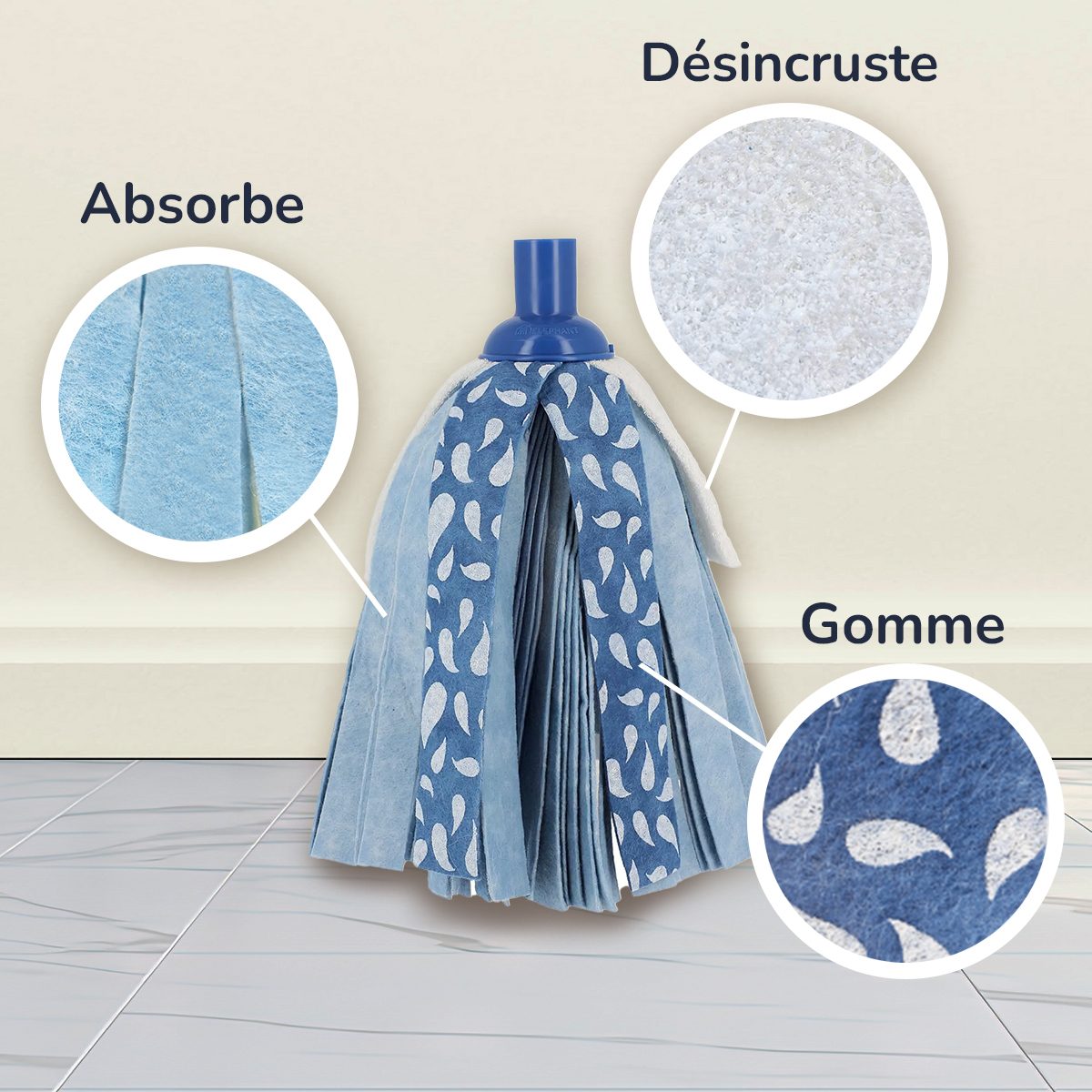 Avant la première utilisation : laissez tremper votre tête à franges 10 à 15 minutes dans de l'eau savonneuse pour améliorer sa qualité d'absorption. .