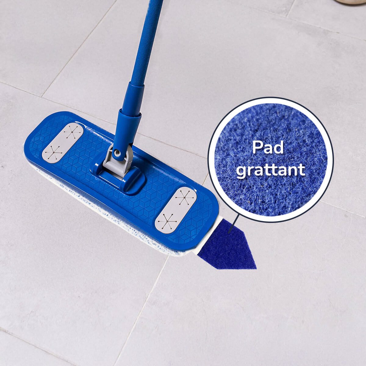 Nouveau: son pad grattant vous permettra de venir à bout des taches récalcitrantes rien qu’avec le pied, sans vous baisser !