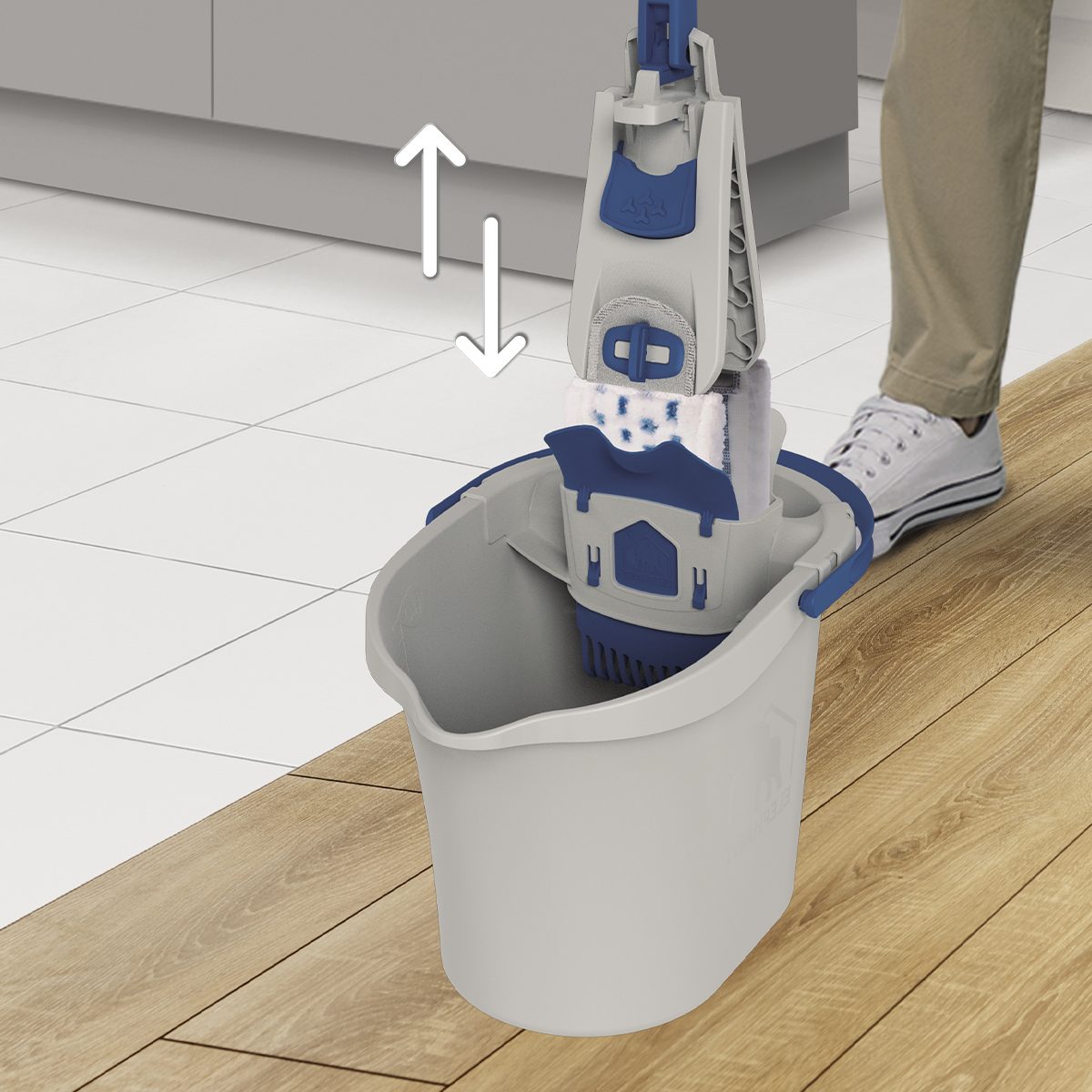 Essorez : insérez le balai dans l'essoreur et appuyez pour essorer la housse