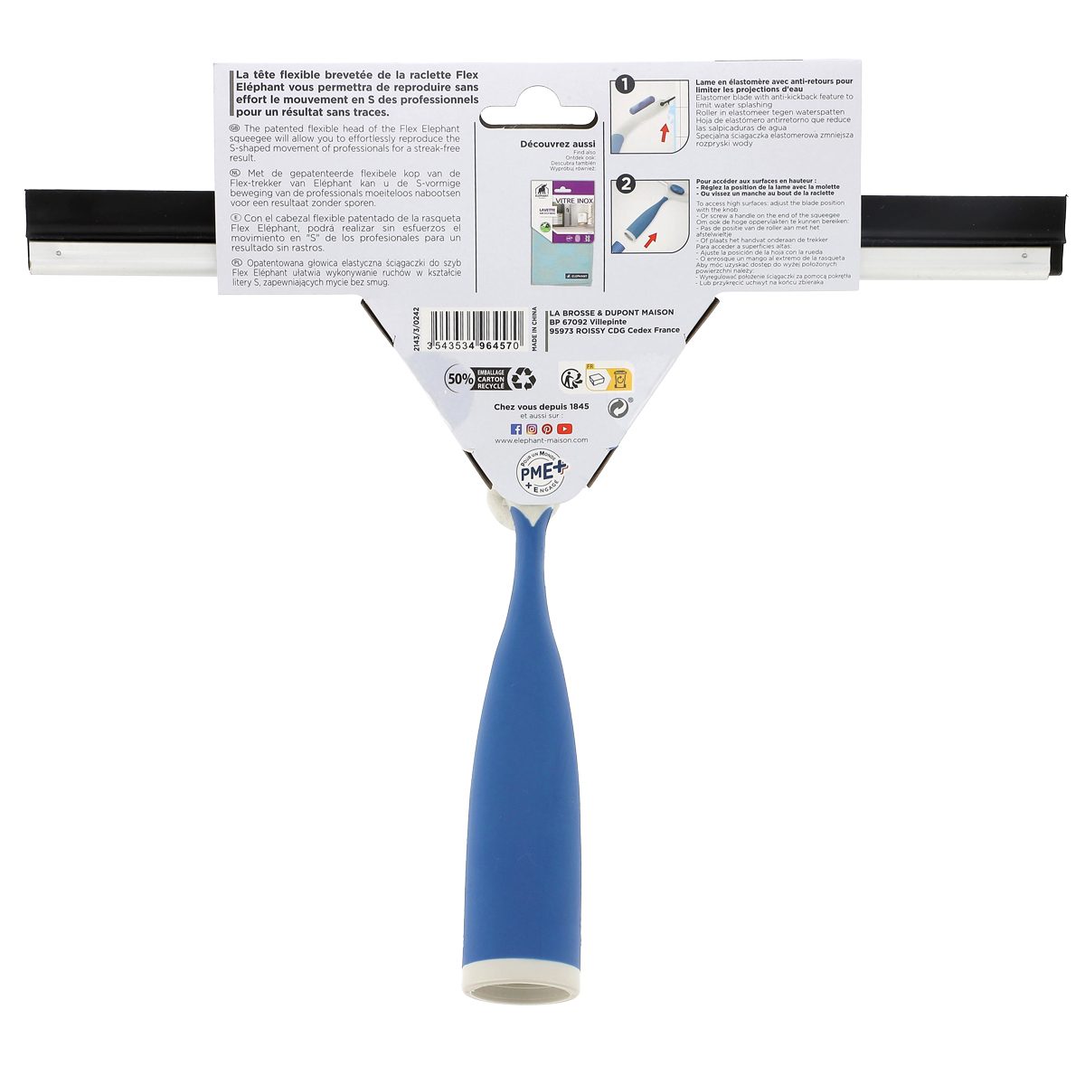 Pour accéder aux surfaces en hauteur ou difficiles d'accès, réglez d'un seul geste la position de la lame avec la molette Eléphant ou vissez un manche au bout de la raclette. La raclette s'adapte à tout type de manche à douille française. Elle est idéale avec les manches Eléphant M3 - Manche aluminium ou M4 - Manche aluminium télescopique